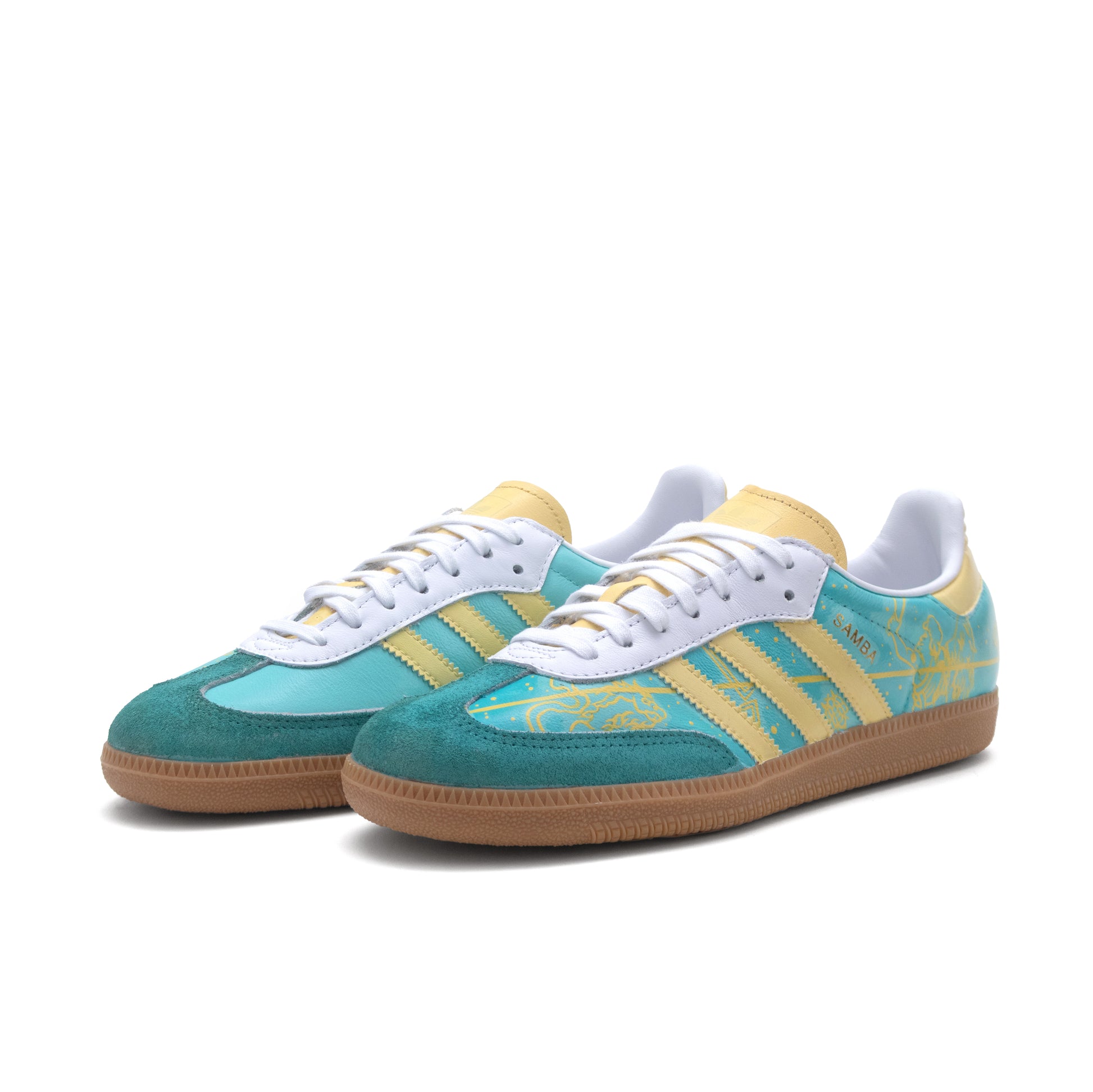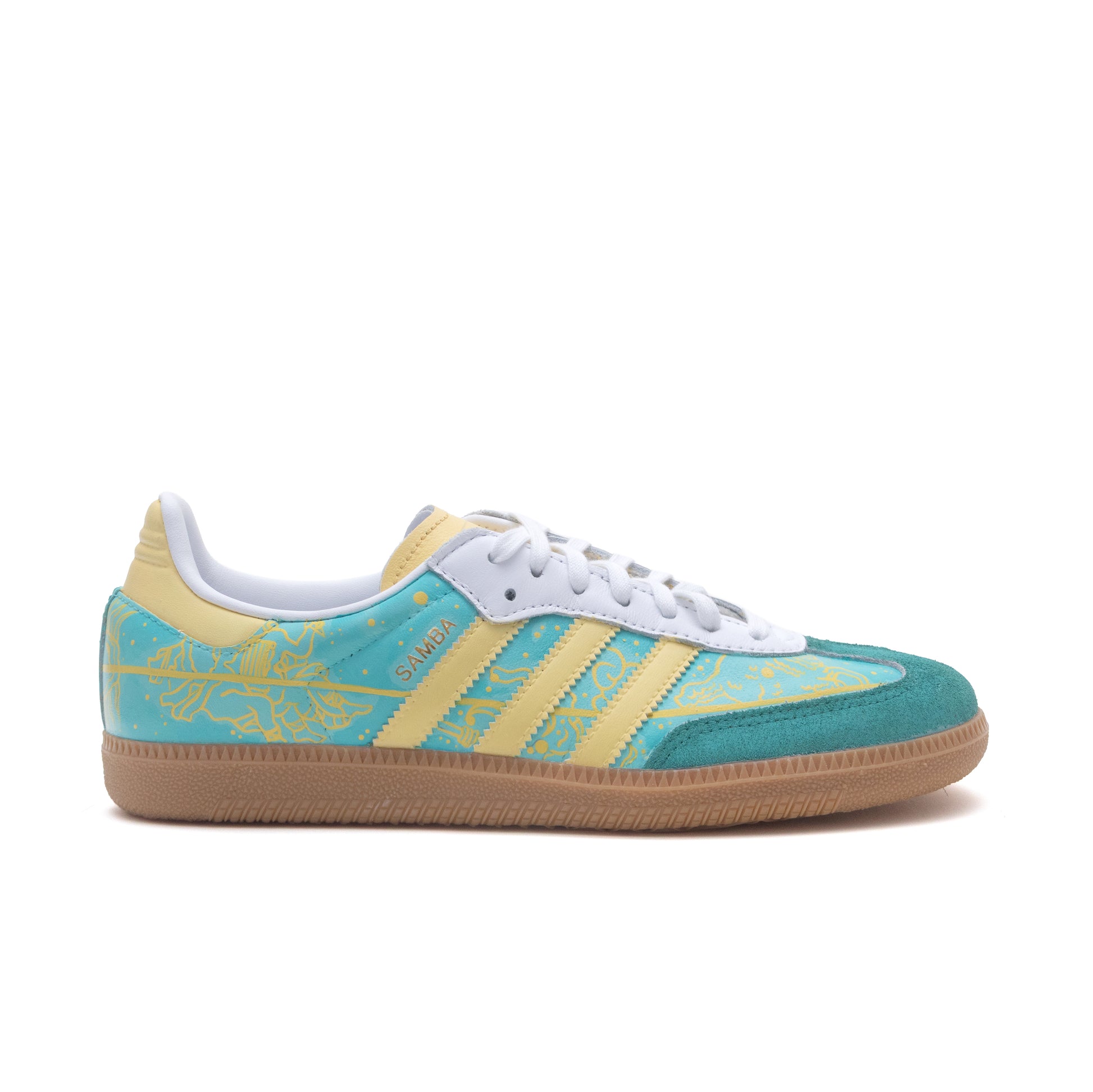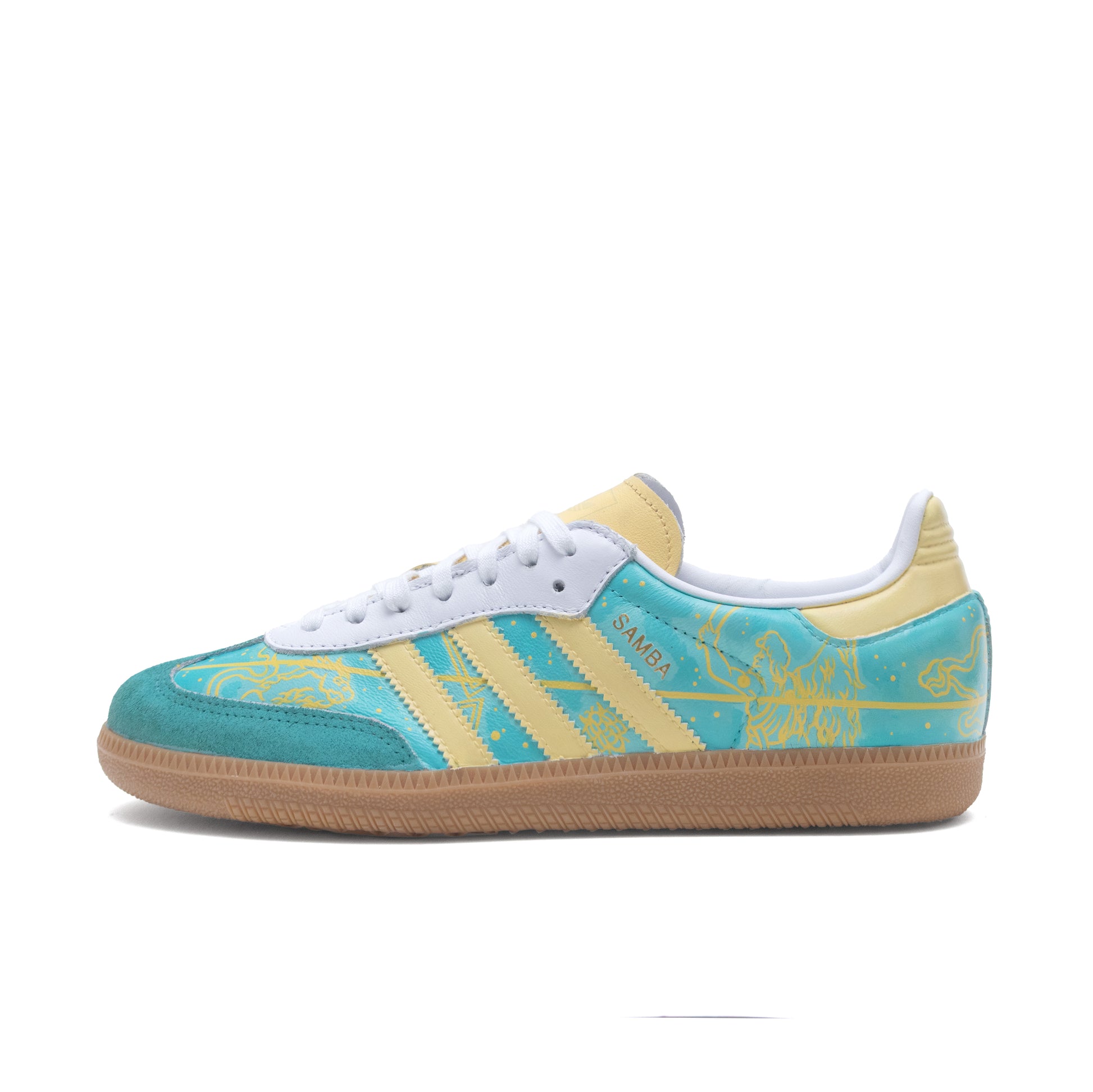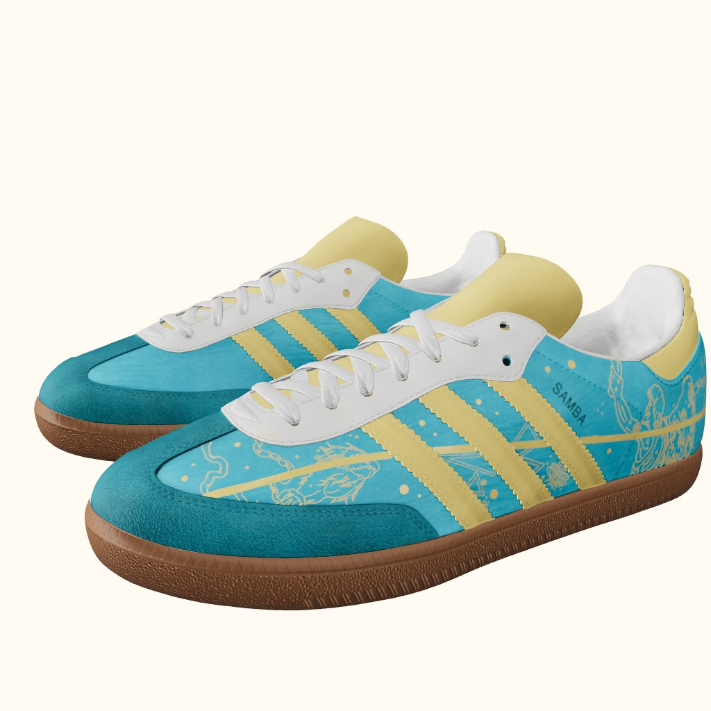 Adidas Samba sneakers featuring a mixed-media design inspired by Grand Central Terminal in New York City. The artwork blends turquoise and beige tones with intricate linework representing the station’s celestial ceiling and timeless architecture. Each pair is hand-painted and detailed with custom vinyl, combining artisanal craftsmanship with modern materials.