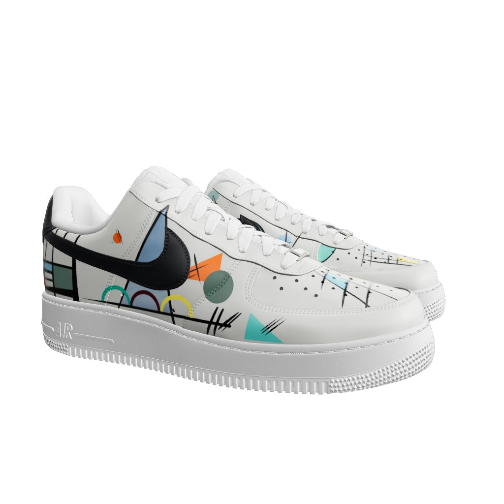 Air Force 1 blancos con diseño pintado a mano inspirado en Kandinski. Nuestro proceso garantiza que el arte sea duradero y mantenga su belleza incluso después de un uso prolongado.