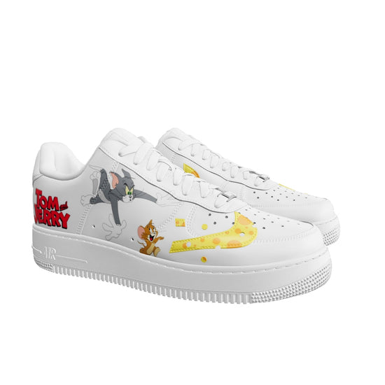 Air Force 1 blancos con diseño pintado a mano inspirado en Tom & Jerry. Nuestro proceso garantiza que el arte sea duradero y mantenga su belleza incluso después de un uso prolongado.