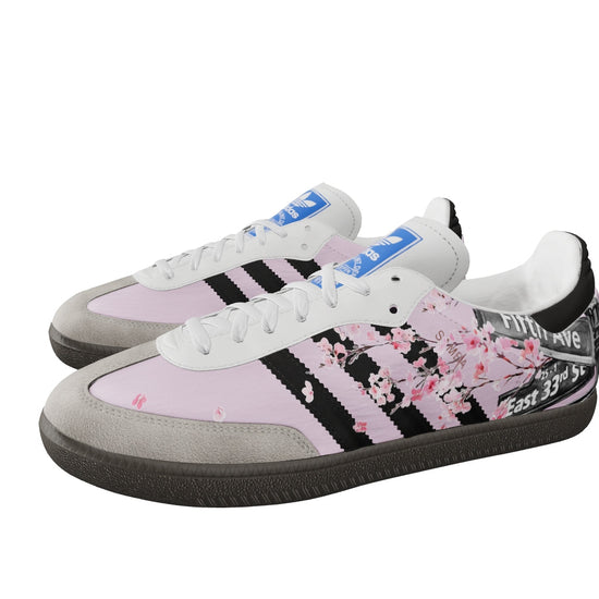 Adidas Samba sneakers featuring a fully hand-painted design inspired by New York spring. The artwork captures the contrast between the city’s chaos and the calm beauty of cherry blossoms, blending pink tones with black stripes and a brown gum sole. Our expert process ensures that the artwork is durable, maintaining its beauty even after extensive wear.