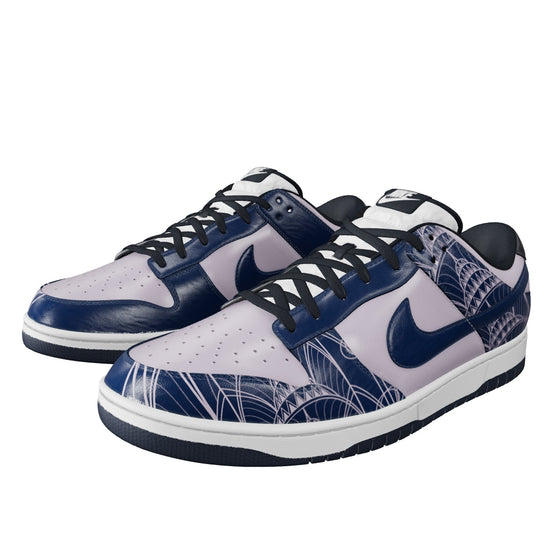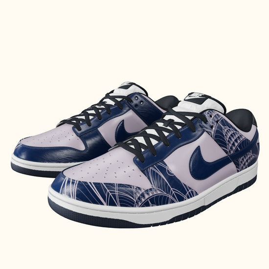 Nike Dunk Low sneakers featuring a fully hand-painted design inspired by the iconic Chrysler Building in New York City. The artwork blends soft pastel pink with deep navy tones, capturing the elegance and geometric sophistication of the Art Deco masterpiece. Each pair is meticulously painted to highlight the architectural rhythm and timeless allure of Manhattan’s skyline.