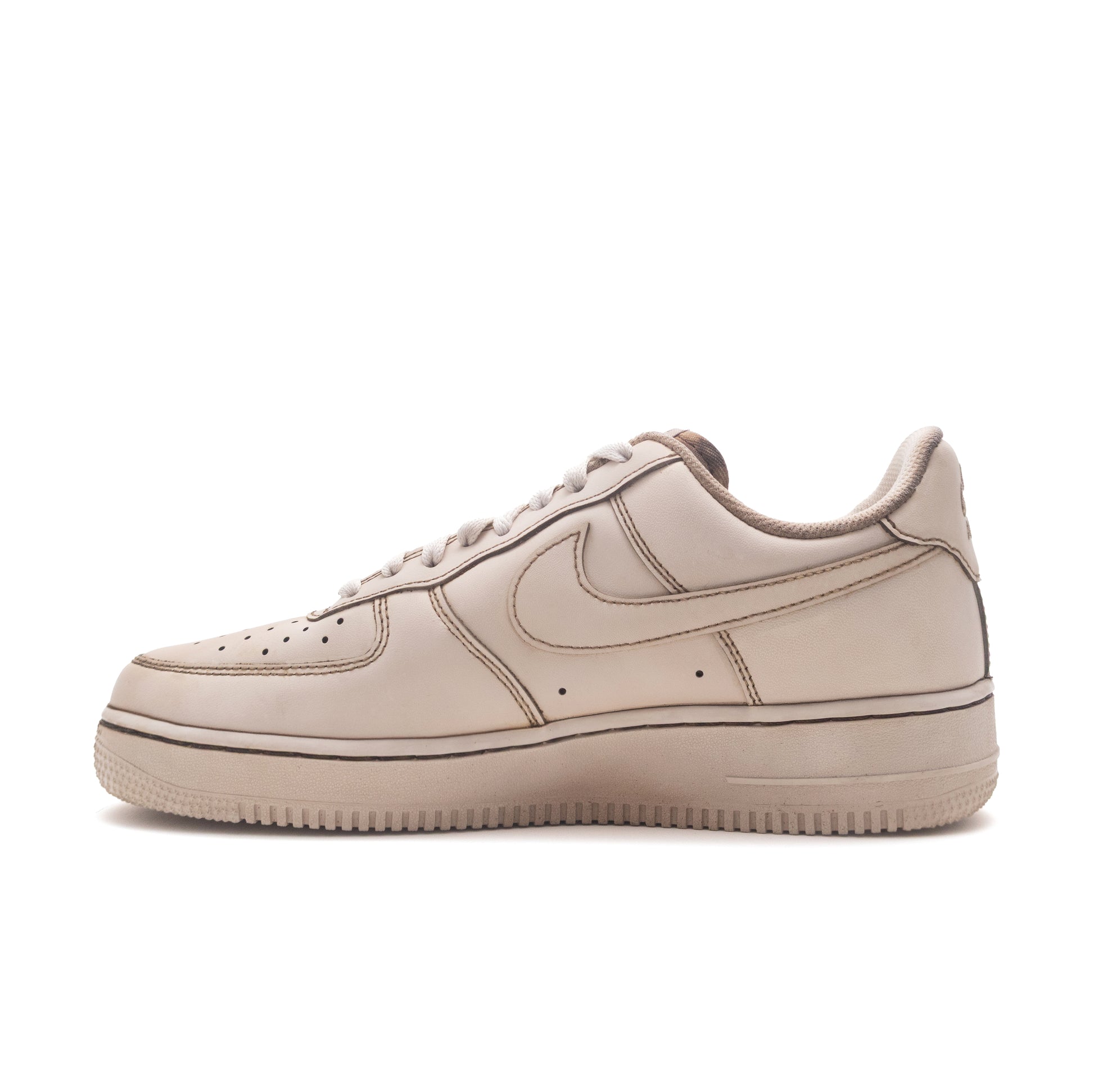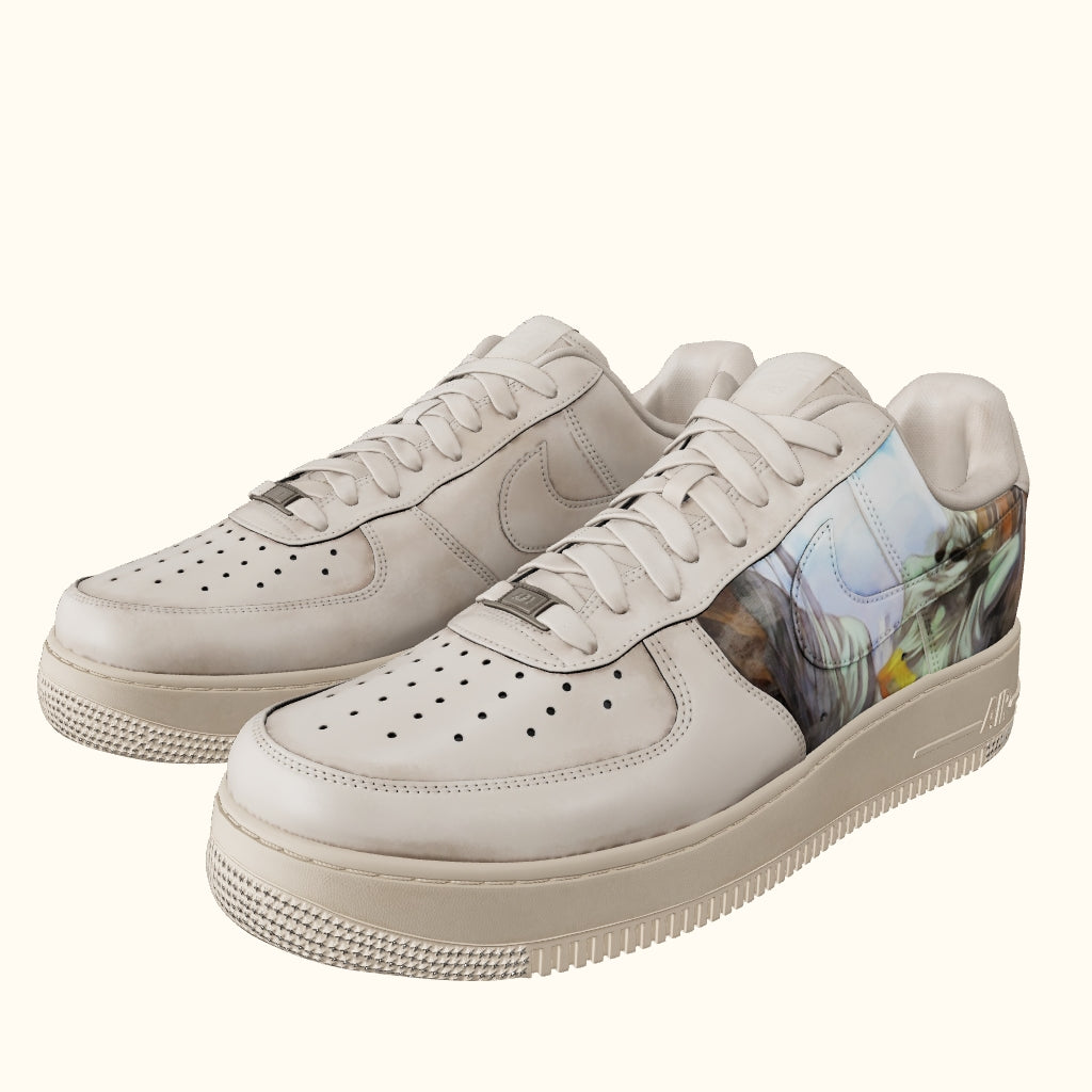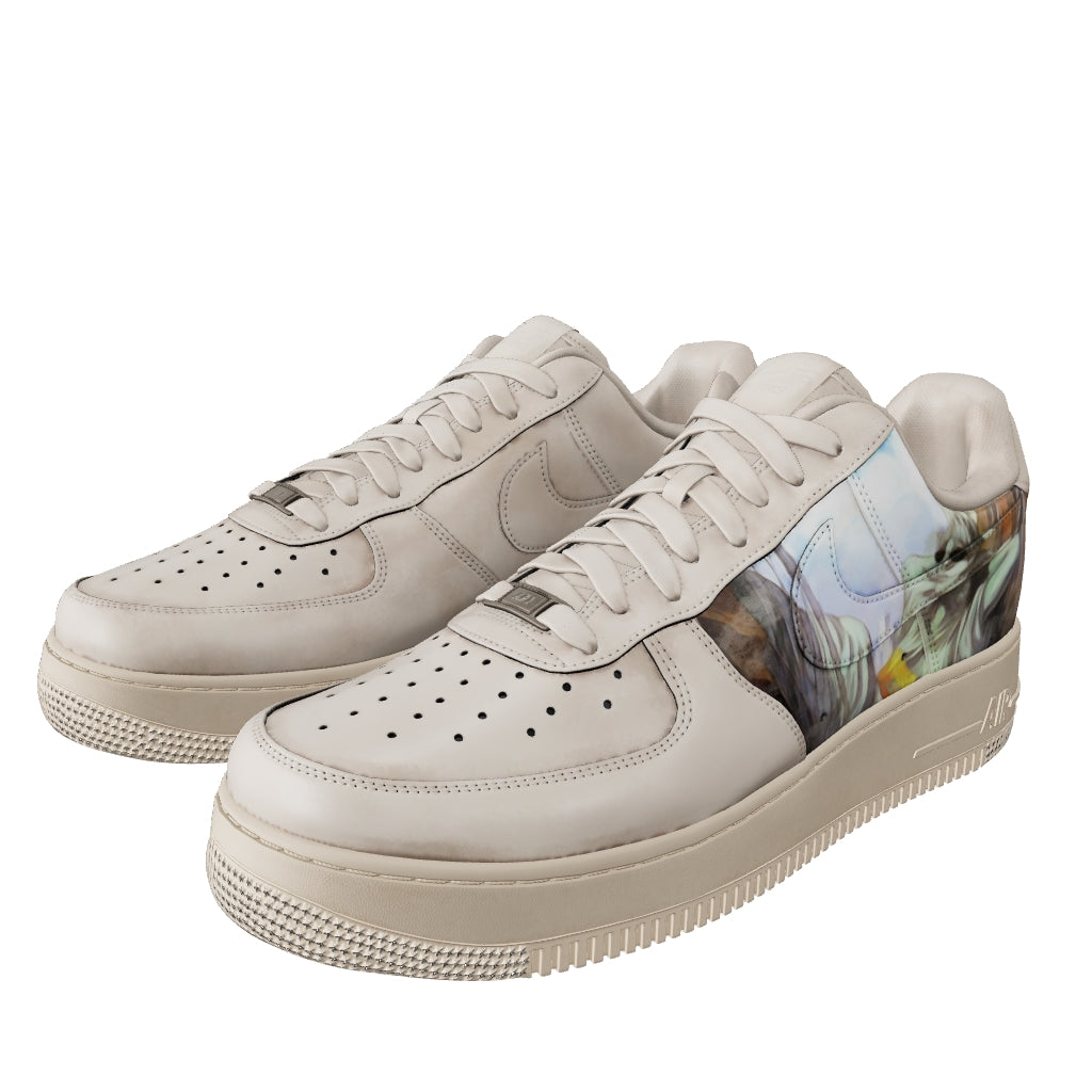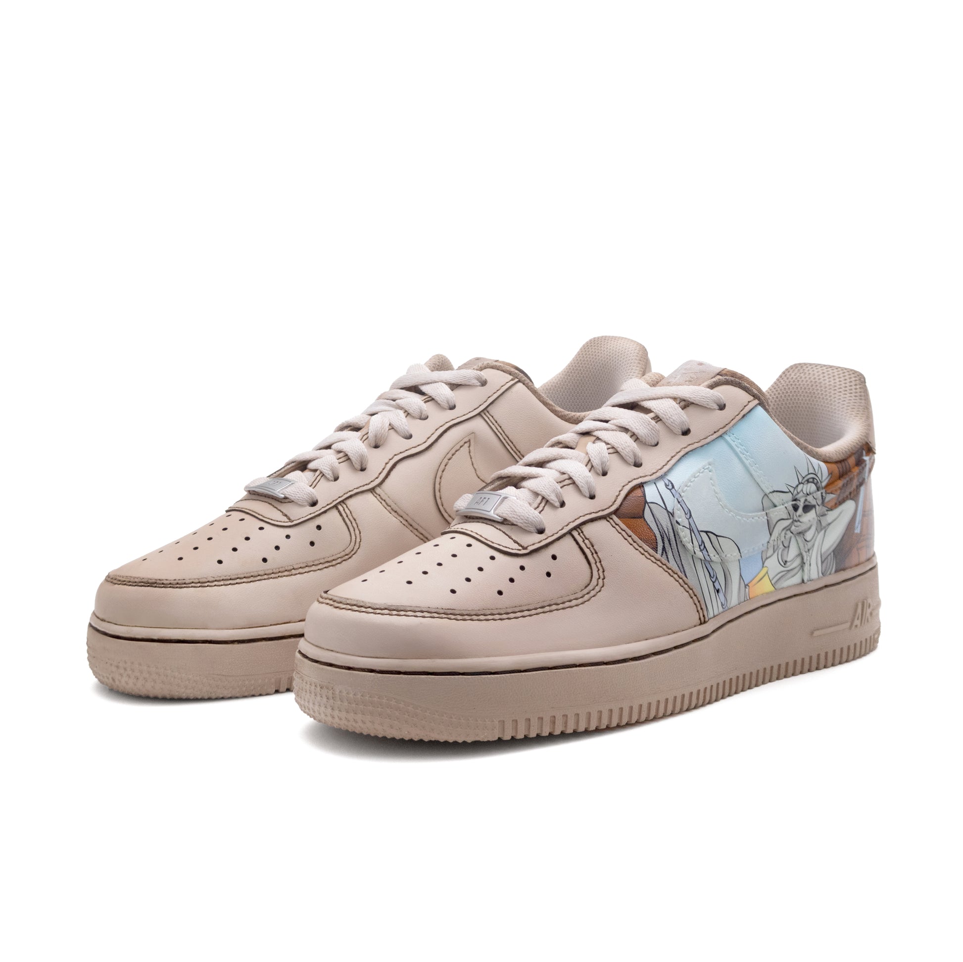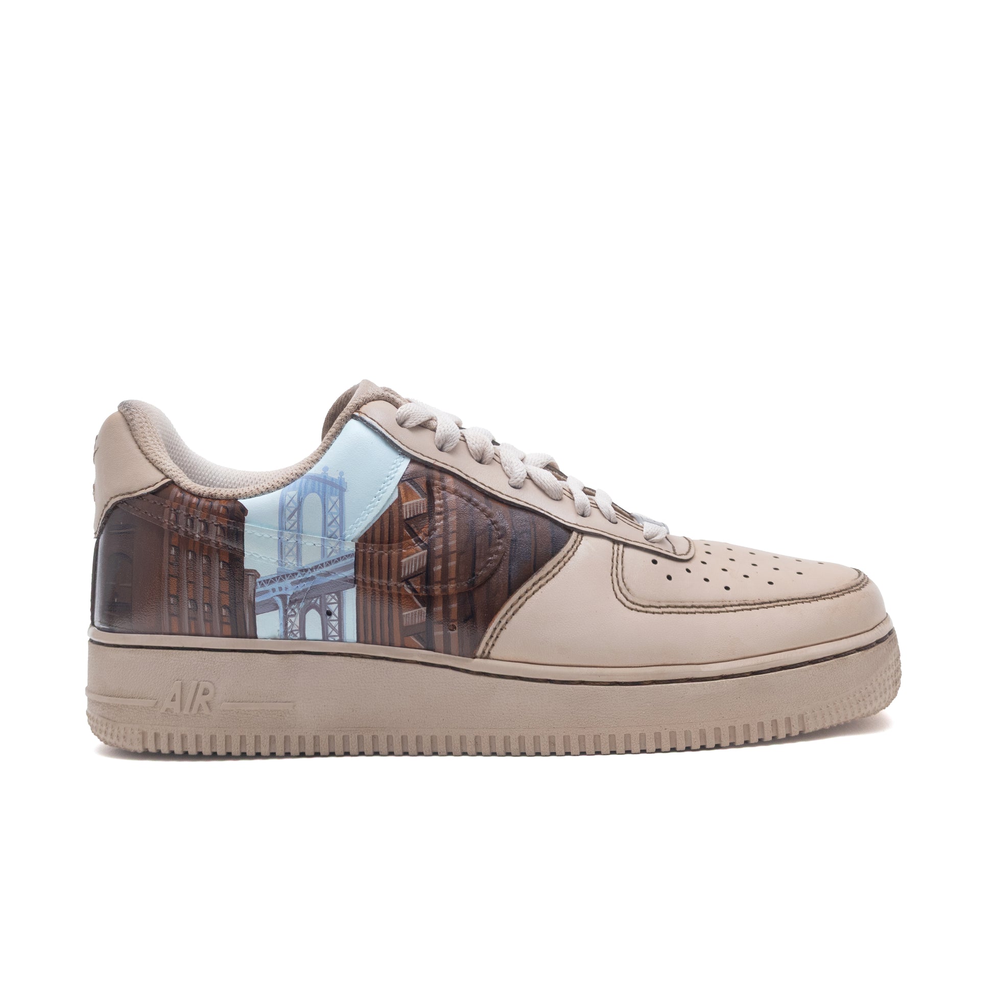Nike Air Force 1 sneakers featuring a hand-painted design inspired by New York City. This pair showcases the Statue of Liberty on one side and the iconic view of Dumbo on the other, blending soft sky tones with earthy browns. The sneakers are hand-dyed in a subtle coffee shade, giving them a vintage and distinctive finish. Our expert process ensures lasting color and durability, preserving the artwork’s charm over time.