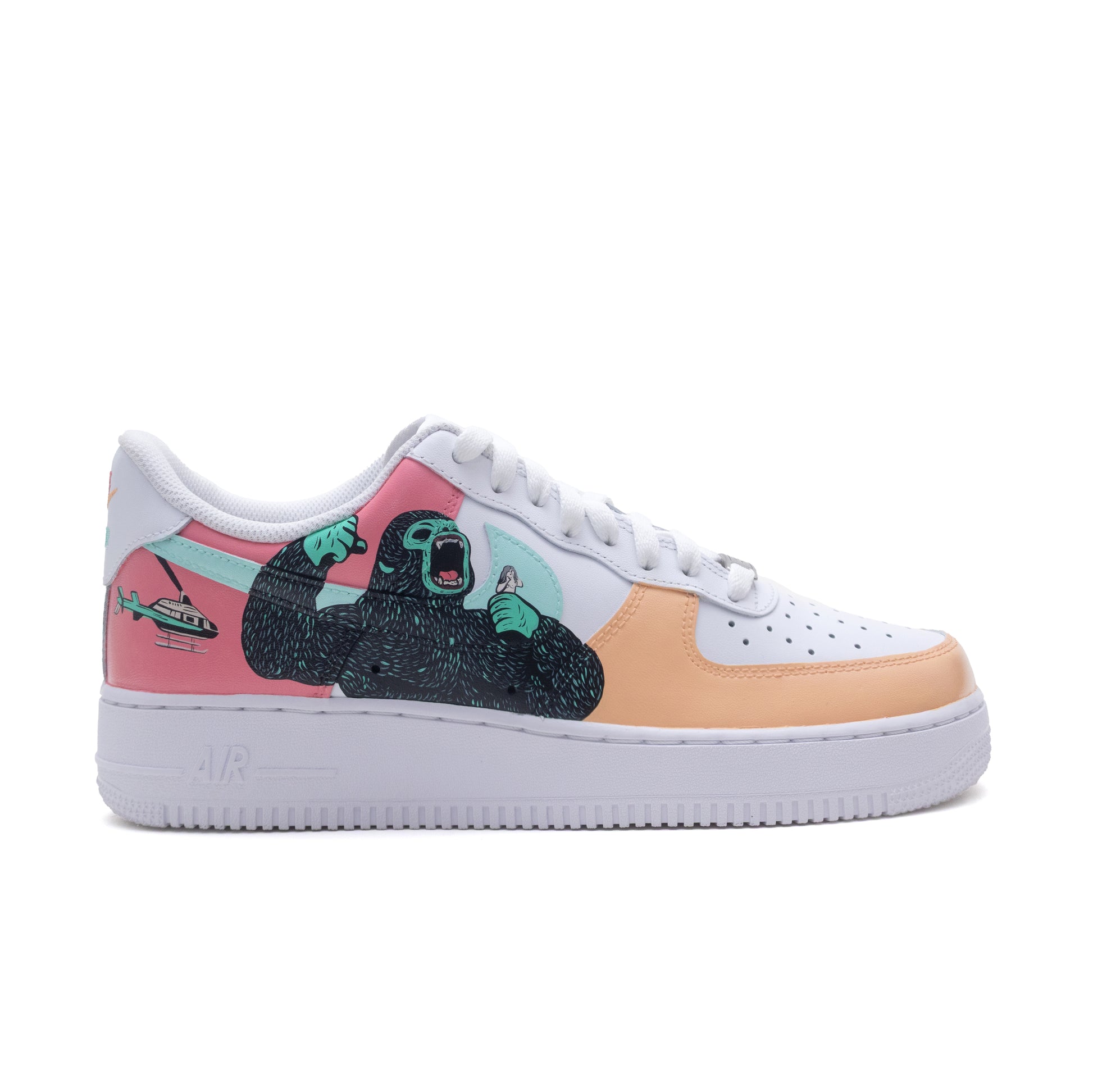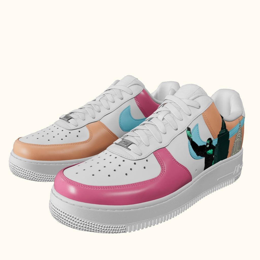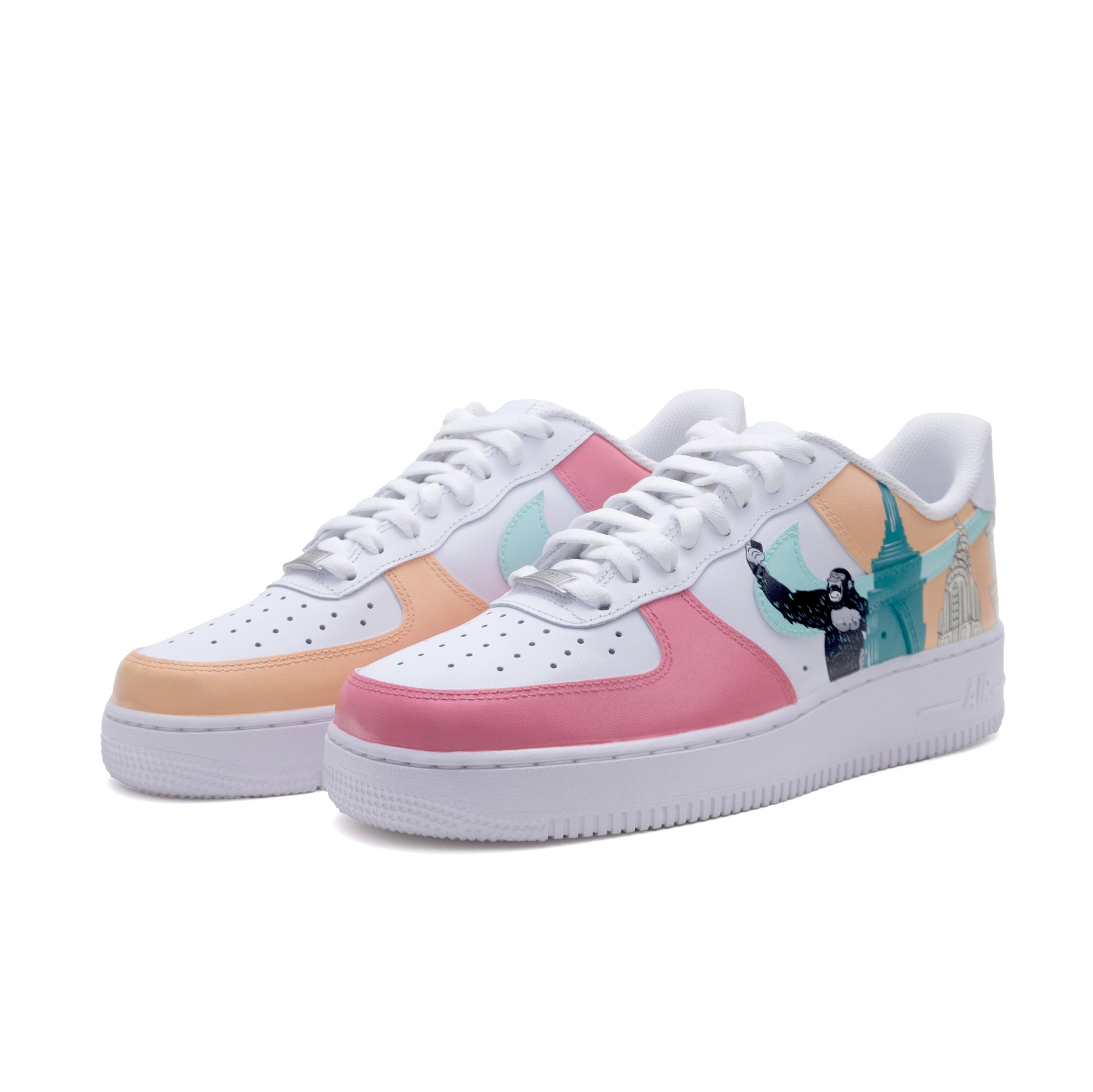 Nike Air Force 1 sneakers featuring a hand-painted design inspired by King Kong’s legendary climb over New York City. This playful yet iconic artwork captures the skyline’s energy with pastel tones and dynamic contrasts that make each pair a true statement piece. Our expert process ensures that the artwork is durable, maintaining its beauty even after extensive wear.