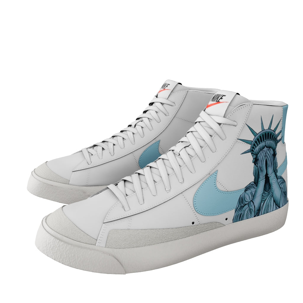 Nike Blazer Mid sneakers featuring a fully hand-painted design portraying the Statue of Liberty in a powerful and emotional reinterpretation. The artwork depicts Lady Liberty covering her face, evoking reflection on modern times while preserving her symbolic strength. Executed in soft turquoise and white tones, the piece contrasts purity and melancholy through its minimalist composition. Each pair is carefully hand-painted to combine social commentary with timeless streetwear art.