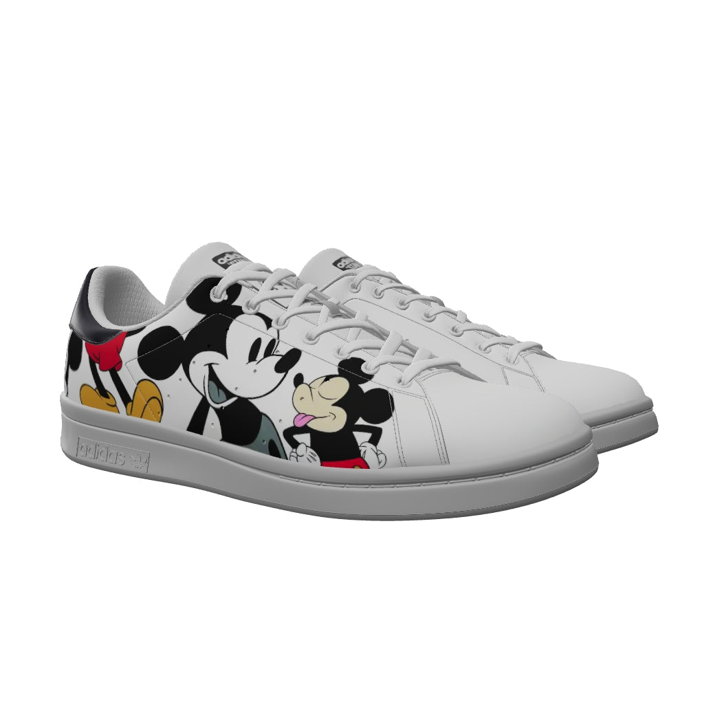 White Adidas Stan Smith trainers featuring a hand-painted design inspired by Mickey Mouse. Our expert process ensures that the artwork is durable, maintaining its beauty even after extensive wear.