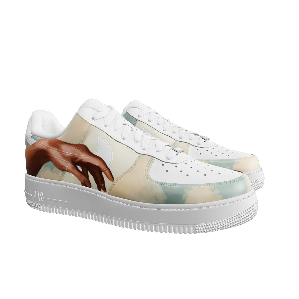 White Air Force 1 trainers featuring a hand-painted design inspired by The Creation of Adam. Our expert process ensures that the artwork is durable, maintaining its beauty even after extensive wear.