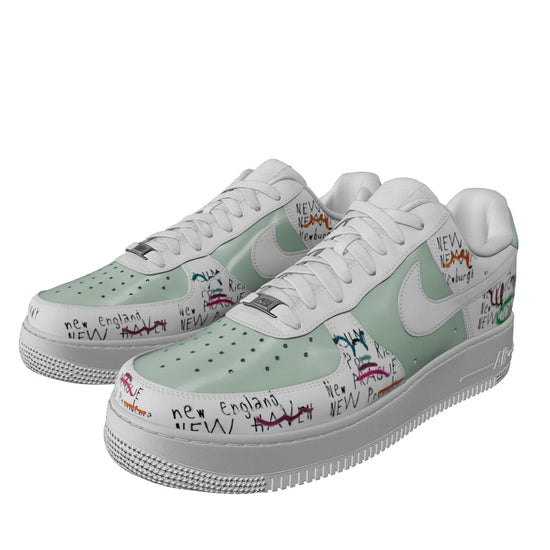 Nike Air Force 1 sneakers featuring a hand-painted design inspired by New York City’s unmatched identity. The artwork lists several cities beginning with “New” — all crossed out, except for “New York,” boldly highlighted to remind us there’s only one. Painted in soft mint tones with handwritten details, this pair blends irony, minimalism, and urban pride. Our expert process ensures long-lasting durability and color quality.